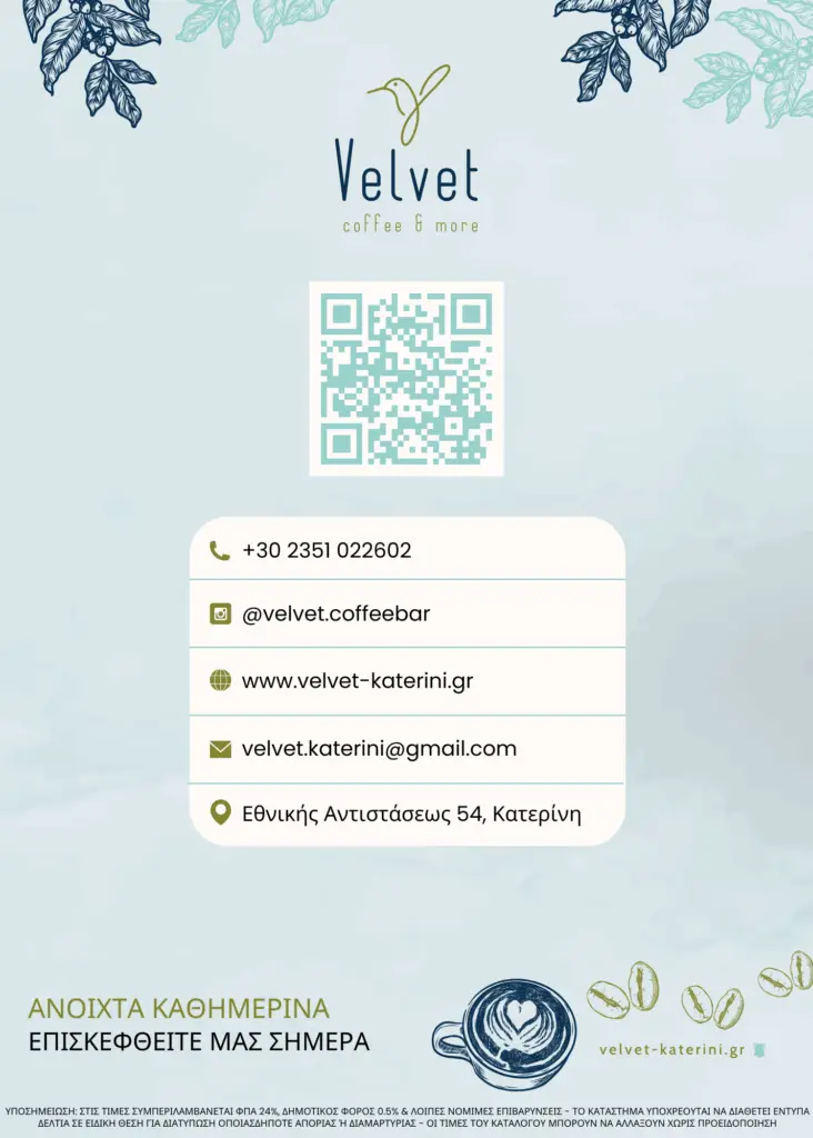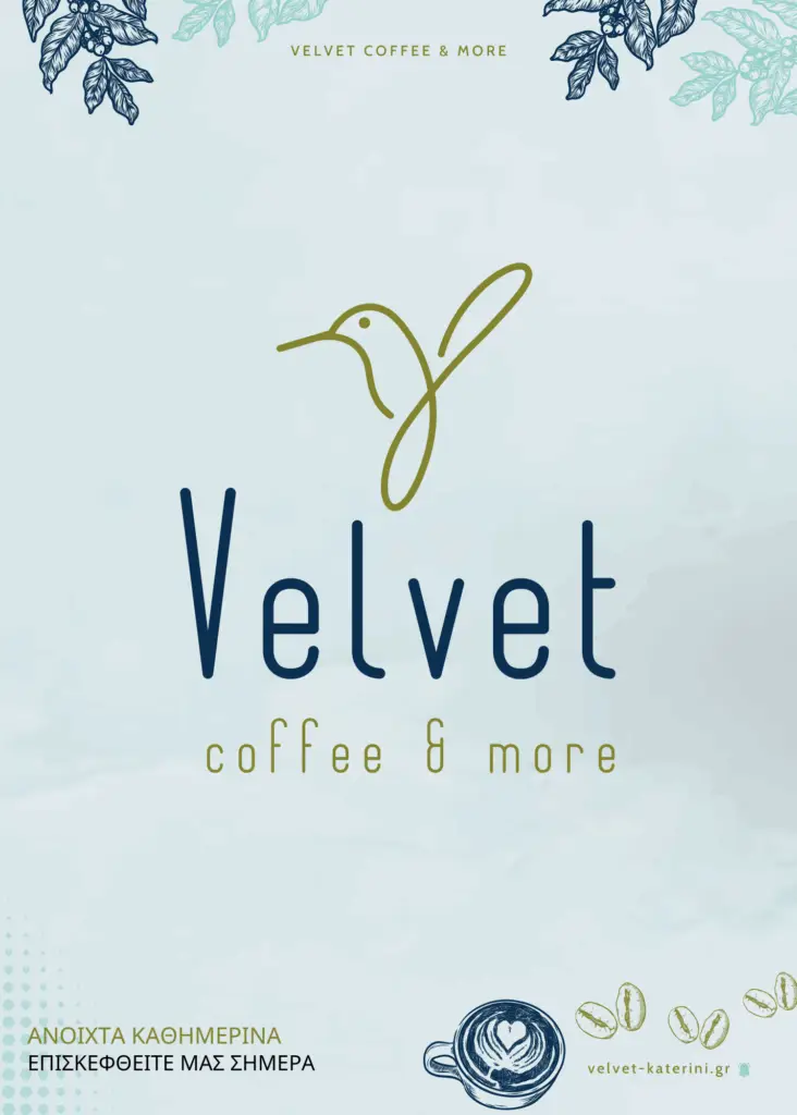 Το Velvet Coffee & more είναι μια kαφετέρια, στην καρδιά της Κατερίνης που είναι ανοιχτή καθημερινά για καφέ, cocktails και διασκέδαση.
